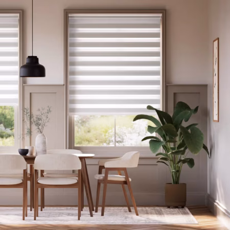 Our dual layer light filtering blinds shift between sheer and opaque bands, giving you full control from daylight to blackout.